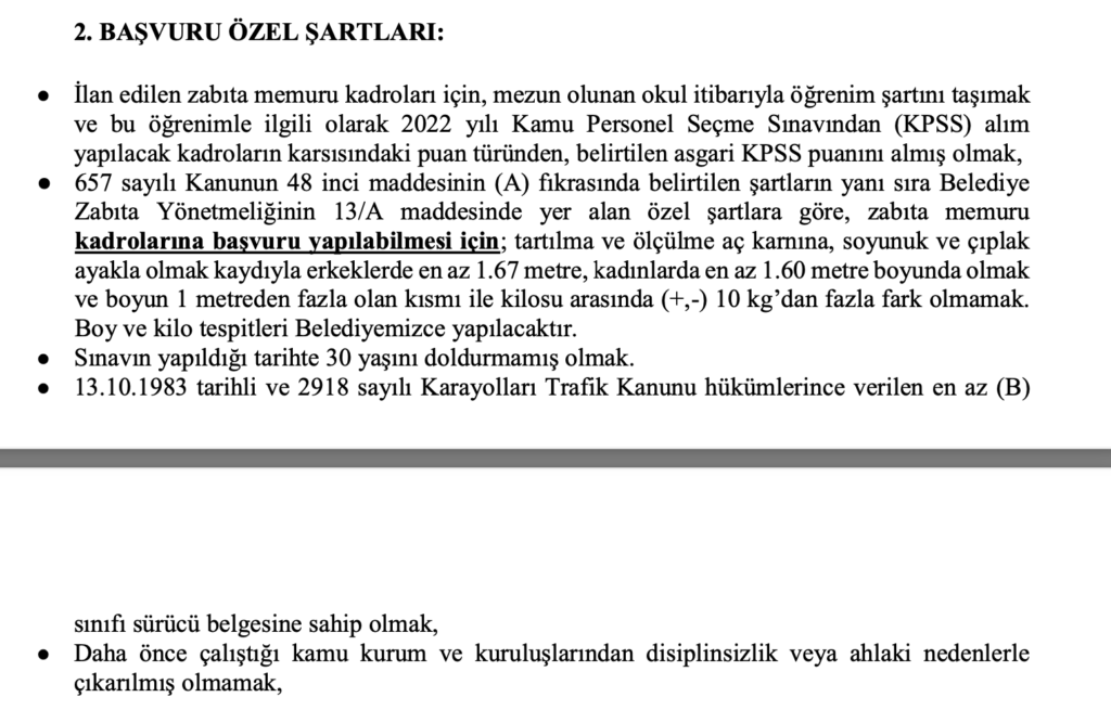 Başvuru için özel şartlar arasında ise en az B sınıfı sürücü belgesine sahip olmak, önlisans programlarından mezun olmak, boy ve kilo ölçütlerine uymak ve 2022 yılı KPSS’de belirtilen asgari puanı almış olmak yer alıyor.
