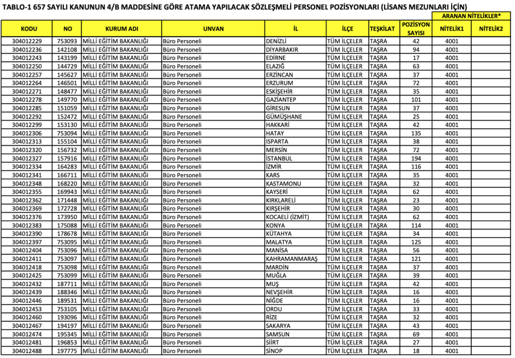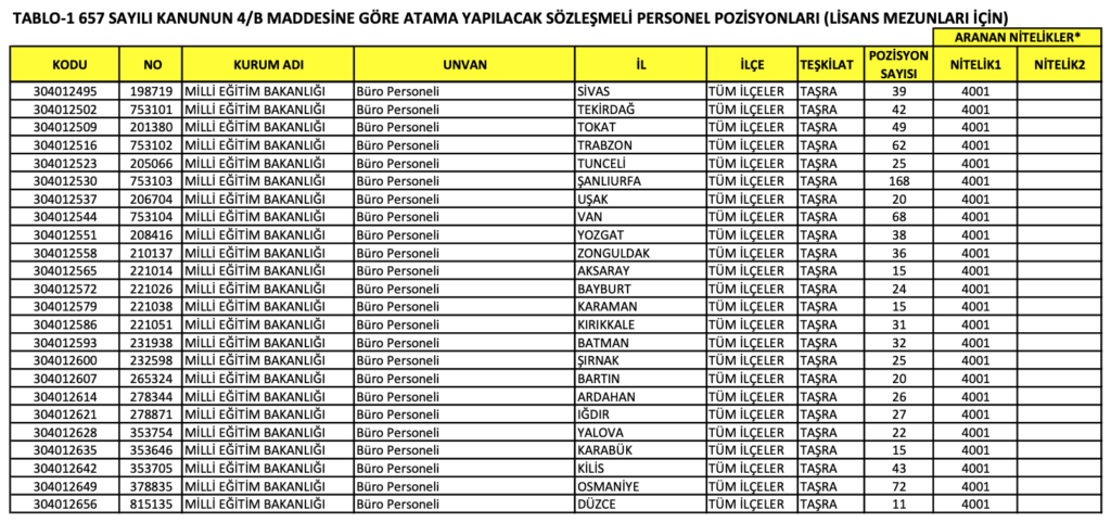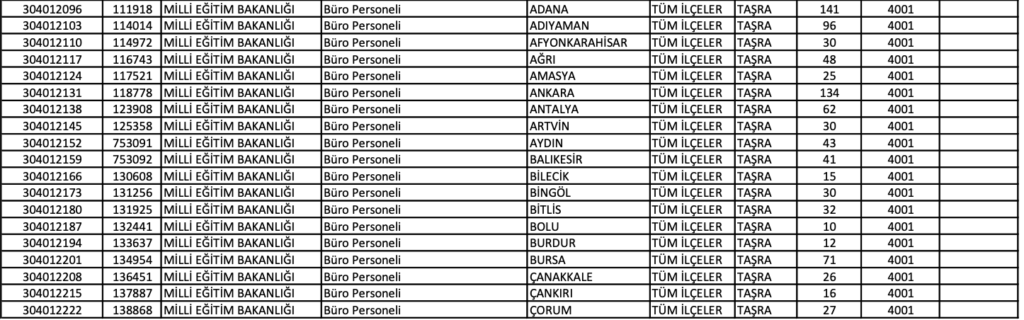 MEB BÜRO PERSONELİ ALIMI KONTENJANLARI