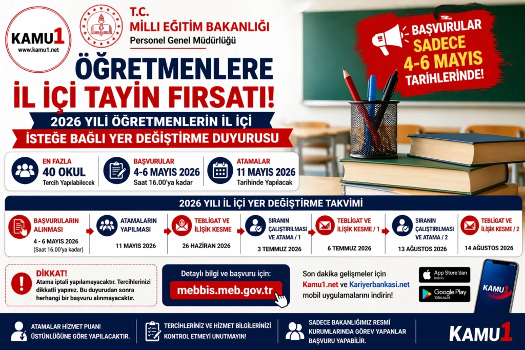 Millî Eğitim Bakanlığı tarafından yayımlanan duyuruya göre, kadrolu öğretmenlerin il içi yer değiştirme işlemleri belirlenen takvim doğrultusunda gerçekleştirilecek. Başvuruların ardından atamalar 11 Mayıs 2026 tarihinde yapılacak.
