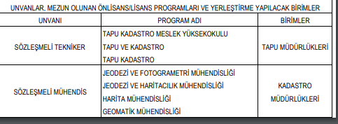 Adaylar belirtilen bölümlerden mezun olmalı. Tekniker için Tapu Kadastro Meslek Yüksekokulu, Mühendis için ise Jeodezi ve Fotogrametri Mühendisliği, Jeodezi ve Haritacılık Mühendisliği, Harita Mühendisliği veya Geomatik Mühendisliği bölümlerinden mezun olmak gerekiyor.